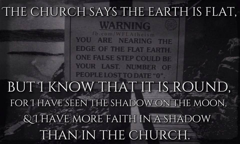 Atheism, Quotes, Science The church says the Earth is flat… Image September 27, 2014 We Fucking Love Atheism Leave a comment Share this: Click to share on X (Opens in new window) X Click to share on Facebook (Opens in new window) Facebook Click to share on Pinterest (Opens in new window) Pinterest Click to share on Tumblr (Opens in new window) Tumblr Click to share on Reddit (Opens in new window) Reddit Related