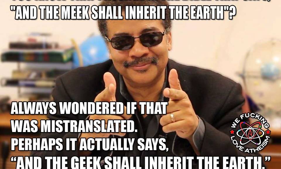 Atheism, Bible Verses, Humor, Neil deGrasse Tyson, Quotes The geek shall inherit the earth. Image October 15, 2014 We Fucking Love Atheism Leave a comment Share this: Click to share on X (Opens in new window) X Click to share on Facebook (Opens in new window) Facebook Click to share on Pinterest (Opens in new window) Pinterest Click to share on Tumblr (Opens in new window) Tumblr Click to share on Reddit (Opens in new window) Reddit Related