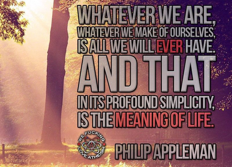 Atheism, Philip Appleman, Quotes The meaning of life Image October 15, 2014 We Fucking Love Atheism Leave a comment Share this: Click to share on X (Opens in new window) X Click to share on Facebook (Opens in new window) Facebook Click to share on Pinterest (Opens in new window) Pinterest Click to share on Tumblr (Opens in new window) Tumblr Click to share on Reddit (Opens in new window) Reddit Related