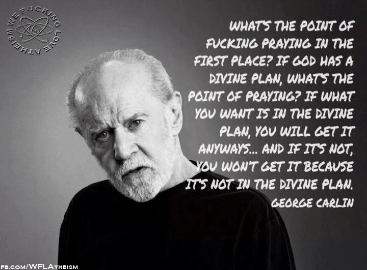 Atheism, George Carlin, Humor, Quotes Whats the point of fucking praying? Image October 15, 2014 We Fucking Love Atheism Leave a comment Share this: Click to share on X (Opens in new window) X Click to share on Facebook (Opens in new window) Facebook Click to share on Pinterest (Opens in new window) Pinterest Click to share on Tumblr (Opens in new window) Tumblr Click to share on Reddit (Opens in new window) Reddit Related