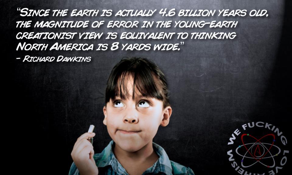 Atheism, Humor, Quotes, Richard Dawkins Earth is 4.6 billion years old Image October 16, 2014 We Fucking Love Atheism Leave a comment Share this: Click to share on X (Opens in new window) X Click to share on Facebook (Opens in new window) Facebook Click to share on Pinterest (Opens in new window) Pinterest Click to share on Tumblr (Opens in new window) Tumblr Click to share on Reddit (Opens in new window) Reddit Related