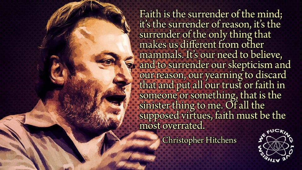 Atheism, Christopher Hitchens, Quotes Faith is the surrender of the mind Image October 16, 2014 We Fucking Love Atheism Leave a comment Share this: Click to share on X (Opens in new window) X Click to share on Facebook (Opens in new window) Facebook Click to share on Pinterest (Opens in new window) Pinterest Click to share on Tumblr (Opens in new window) Tumblr Click to share on Reddit (Opens in new window) Reddit Related