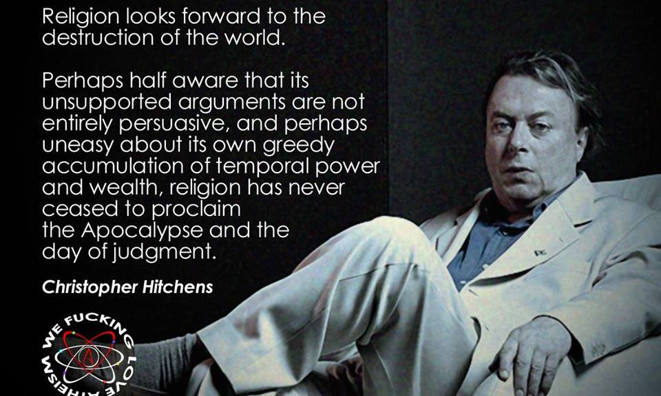 Atheism, Christopher Hitchens, Quotes Religion looks forward to the destruction of the world Image October 24, 2014 We Fucking Love Atheism Leave a comment Share this: Click to share on X (Opens in new window) X Click to share on Facebook (Opens in new window) Facebook Click to share on Pinterest (Opens in new window) Pinterest Click to share on Tumblr (Opens in new window) Tumblr Click to share on Reddit (Opens in new window) Reddit Related