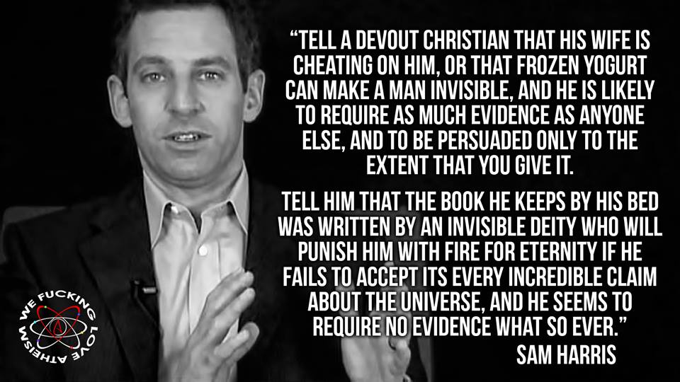 Atheism, Quotes, Sam Harris No evidence Image October 25, 2014 We Fucking Love Atheism Leave a comment Share this: Click to share on X (Opens in new window) X Click to share on Facebook (Opens in new window) Facebook Click to share on Pinterest (Opens in new window) Pinterest Click to share on Tumblr (Opens in new window) Tumblr Click to share on Reddit (Opens in new window) Reddit Related