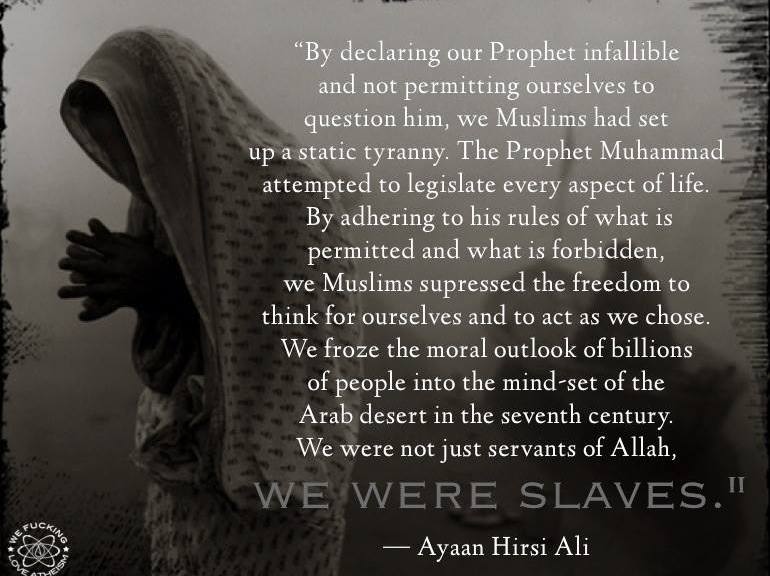 Ayaan Hirsi Ali, Female Voices, Islam, Quotes We were slaves Image October 28, 2014 We Fucking Love Atheism Leave a comment Share this: Click to share on X (Opens in new window) X Click to share on Facebook (Opens in new window) Facebook Click to share on Pinterest (Opens in new window) Pinterest Click to share on Tumblr (Opens in new window) Tumblr Click to share on Reddit (Opens in new window) Reddit Related