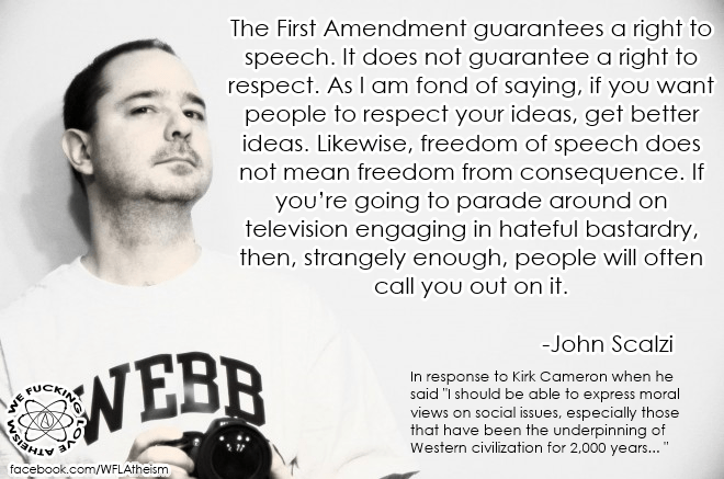 Atheism, Equality, John Scalzi, Quotes Freedom of speech does not mean the freedom from consequences Image November 20, 2014 We Fucking Love Atheism Leave a comment Share this: Click to share on X (Opens in new window) X Click to share on Facebook (Opens in new window) Facebook Click to share on Pinterest (Opens in new window) Pinterest Click to share on Tumblr (Opens in new window) Tumblr Click to share on Reddit (Opens in new window) Reddit Related