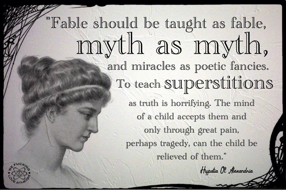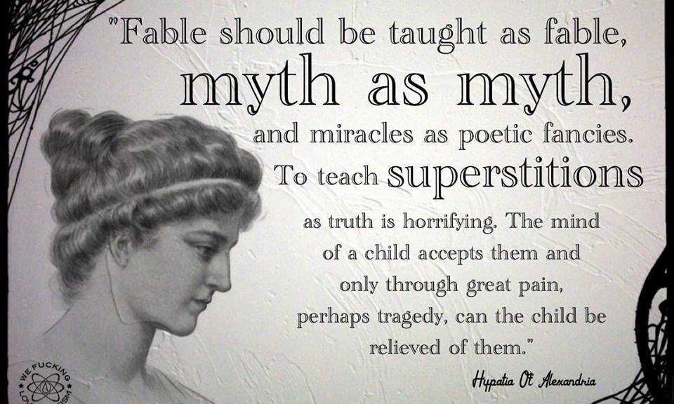 Atheism, Female Voices, Hypatia of Alexandria, Quotes Fable as fable, myth as myth Image November 21, 2014 We Fucking Love Atheism Leave a comment Share this: Click to share on X (Opens in new window) X Click to share on Facebook (Opens in new window) Facebook Click to share on Pinterest (Opens in new window) Pinterest Click to share on Tumblr (Opens in new window) Tumblr Click to share on Reddit (Opens in new window) Reddit Related