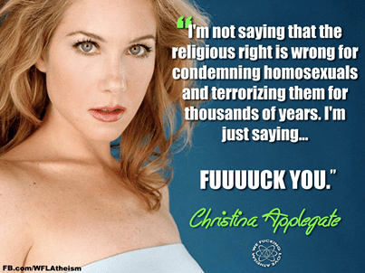 Christina Applegate, Equality, Female Voices, Quotes “Fuuuuuck You” Image November 21, 2014 We Fucking Love Atheism Leave a comment Share this: Click to share on X (Opens in new window) X Click to share on Facebook (Opens in new window) Facebook Click to share on Pinterest (Opens in new window) Pinterest Click to share on Tumblr (Opens in new window) Tumblr Click to share on Reddit (Opens in new window) Reddit Related