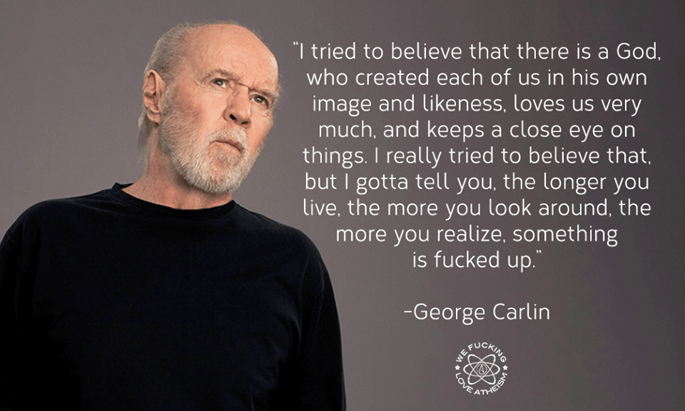 Atheism, George Carlin, Humor, Quotes I tried to believe in god Image November 21, 2014 We Fucking Love Atheism Leave a comment Share this: Click to share on X (Opens in new window) X Click to share on Facebook (Opens in new window) Facebook Click to share on Pinterest (Opens in new window) Pinterest Click to share on Tumblr (Opens in new window) Tumblr Click to share on Reddit (Opens in new window) Reddit Related