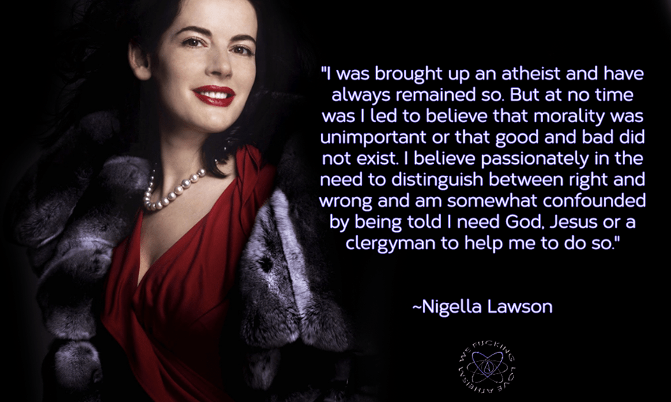 Atheism, Female Voices, Nigella Lawson, Quotes Right and wrong Image November 21, 2014 We Fucking Love Atheism Leave a comment Share this: Click to share on X (Opens in new window) X Click to share on Facebook (Opens in new window) Facebook Click to share on Pinterest (Opens in new window) Pinterest Click to share on Tumblr (Opens in new window) Tumblr Click to share on Reddit (Opens in new window) Reddit Related