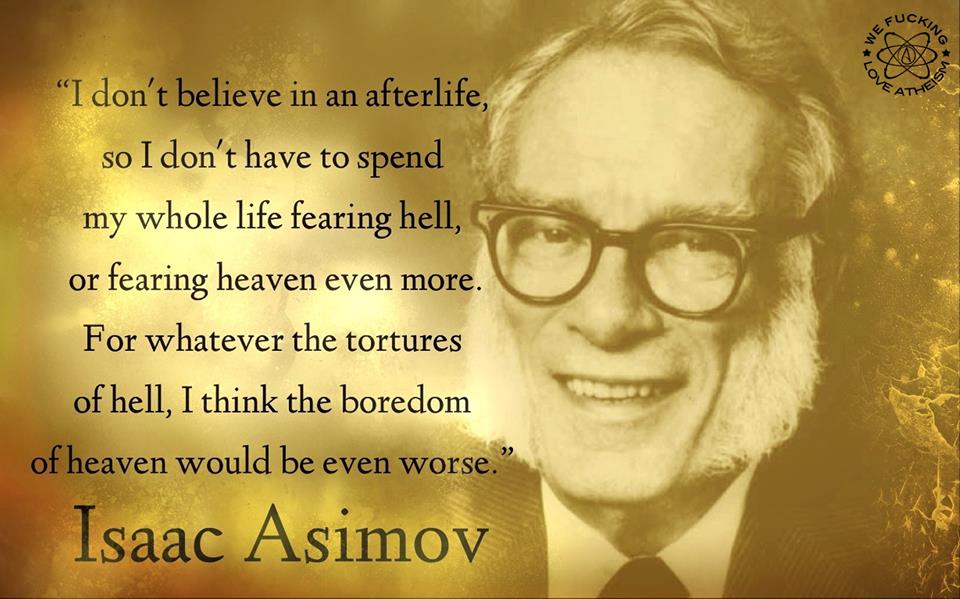 Atheism, Isaac Asimov, Quotes The boredom of heaven would be worse Image November 21, 2014 We Fucking Love Atheism Leave a comment Share this: Click to share on X (Opens in new window) X Click to share on Facebook (Opens in new window) Facebook Click to share on Pinterest (Opens in new window) Pinterest Click to share on Tumblr (Opens in new window) Tumblr Click to share on Reddit (Opens in new window) Reddit Related