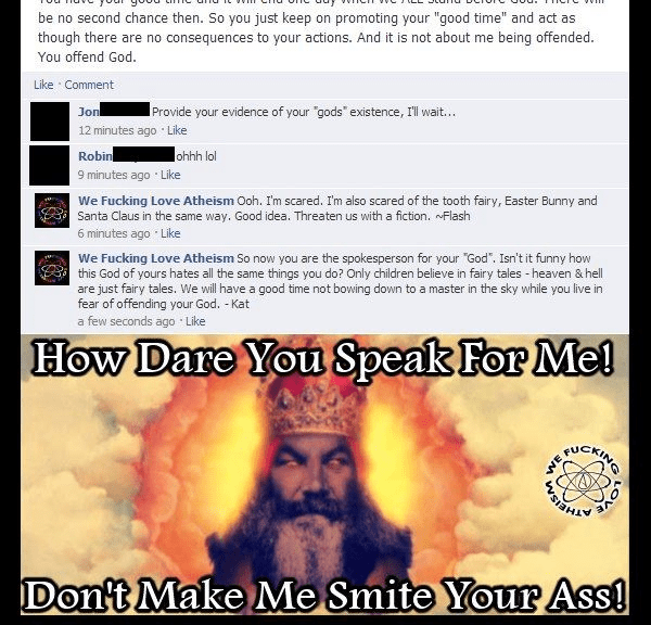 Atheism, Bible Verses, Humor SMITE! Image November 26, 2014 We Fucking Love Atheism Leave a comment Share this: Click to share on X (Opens in new window) X Click to share on Facebook (Opens in new window) Facebook Click to share on Pinterest (Opens in new window) Pinterest Click to share on Tumblr (Opens in new window) Tumblr Click to share on Reddit (Opens in new window) Reddit Related