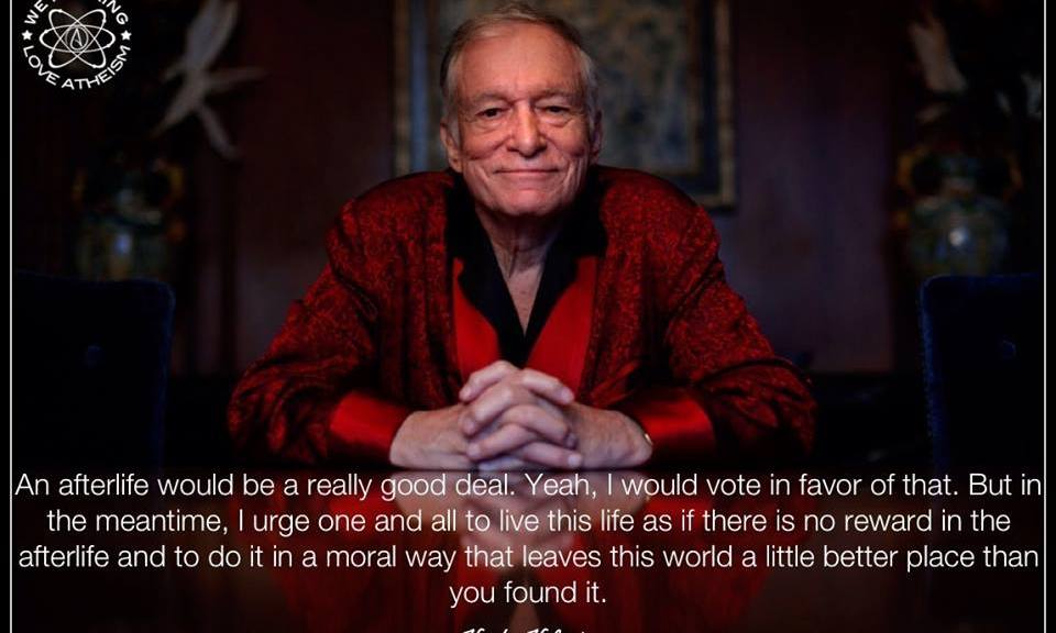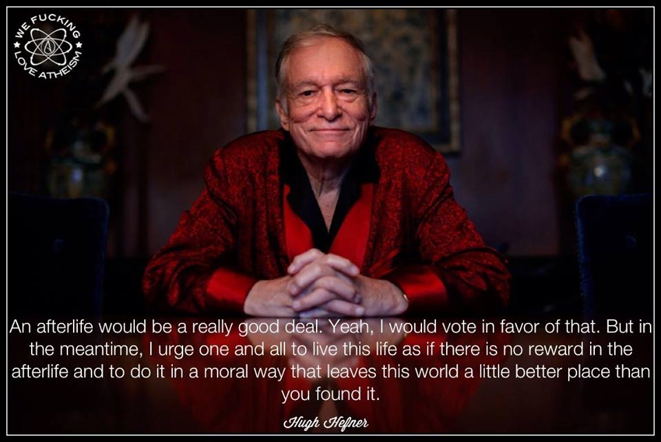 Atheism, Hugh Hefner, Quotes No reward in the afterlife Image December 2, 2014 We Fucking Love Atheism Leave a comment Share this: Click to share on X (Opens in new window) X Click to share on Facebook (Opens in new window) Facebook Click to share on Pinterest (Opens in new window) Pinterest Click to share on Tumblr (Opens in new window) Tumblr Click to share on Reddit (Opens in new window) Reddit Related
