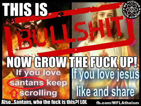 Atheism, Humor Santans?! Image December 19, 2014 We Fucking Love Atheism Leave a comment Share this: Click to share on X (Opens in new window) X Click to share on Facebook (Opens in new window) Facebook Click to share on Pinterest (Opens in new window) Pinterest Click to share on Tumblr (Opens in new window) Tumblr Click to share on Reddit (Opens in new window) Reddit Related