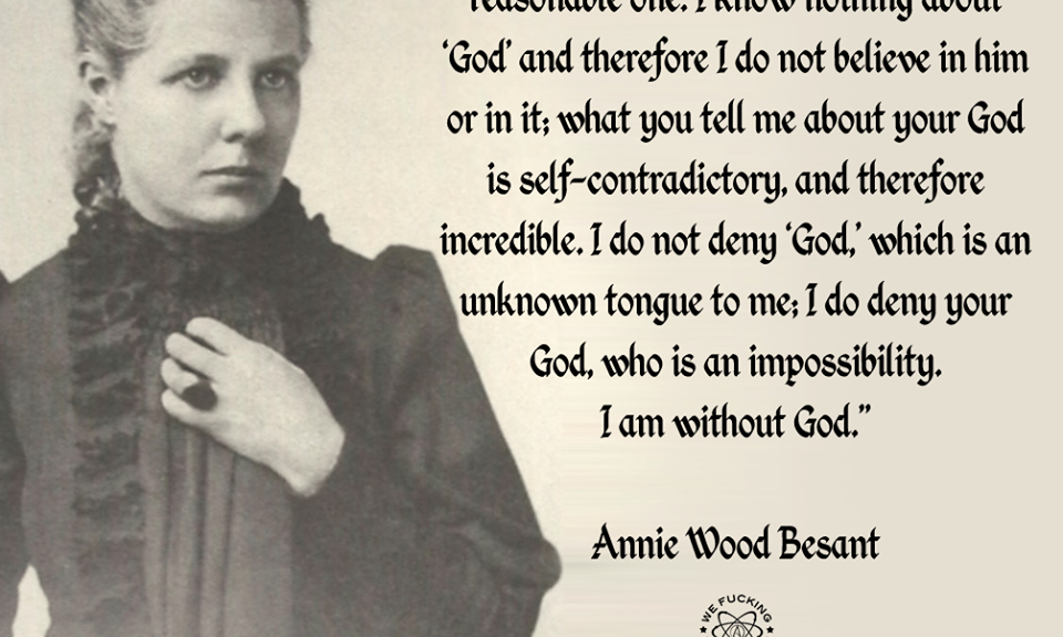 Annie Wood Besant, Atheism, Female Voices, Quotes I am without god Image December 2, 2014 We Fucking Love Atheism Leave a comment
