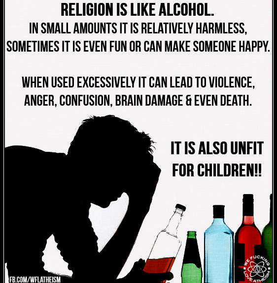 Atheism Religion is like alcohol Image February 12, 2015 We Fucking Love Atheism Leave a comment Share this: Click to share on X (Opens in new window) X Click to share on Facebook (Opens in new window) Facebook Click to share on Pinterest (Opens in new window) Pinterest Click to share on Tumblr (Opens in new window) Tumblr Click to share on Reddit (Opens in new window) Reddit Related