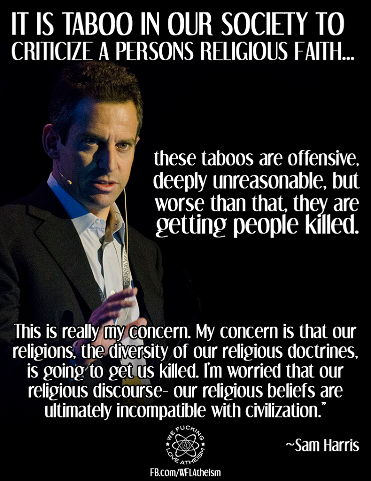 Atheism, Quotes, Sam Harris It is taboo Image February 20, 2015 We Fucking Love Atheism Leave a comment Share this: Click to share on X (Opens in new window) X Click to share on Facebook (Opens in new window) Facebook Click to share on Pinterest (Opens in new window) Pinterest Click to share on Tumblr (Opens in new window) Tumblr Click to share on Reddit (Opens in new window) Reddit Related