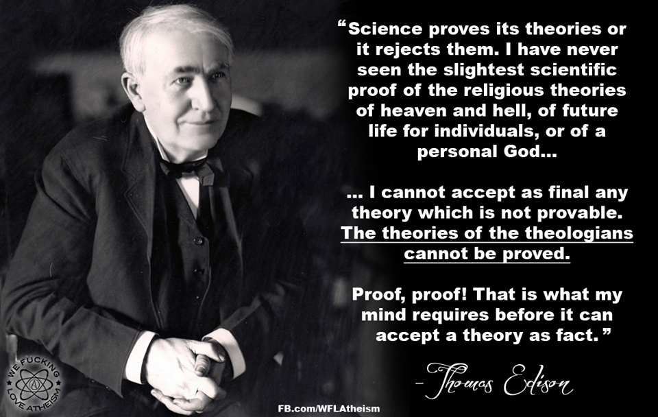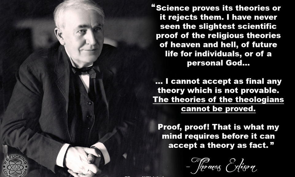 Atheism, Quotes, Science, Thomas Edison The theories of theologians cannot be proved Image February 27, 2015 We Fucking Love Atheism Leave a comment Share this: Click to share on X (Opens in new window) X Click to share on Facebook (Opens in new window) Facebook Click to share on Pinterest (Opens in new window) Pinterest Click to share on Tumblr (Opens in new window) Tumblr Click to share on Reddit (Opens in new window) Reddit Related