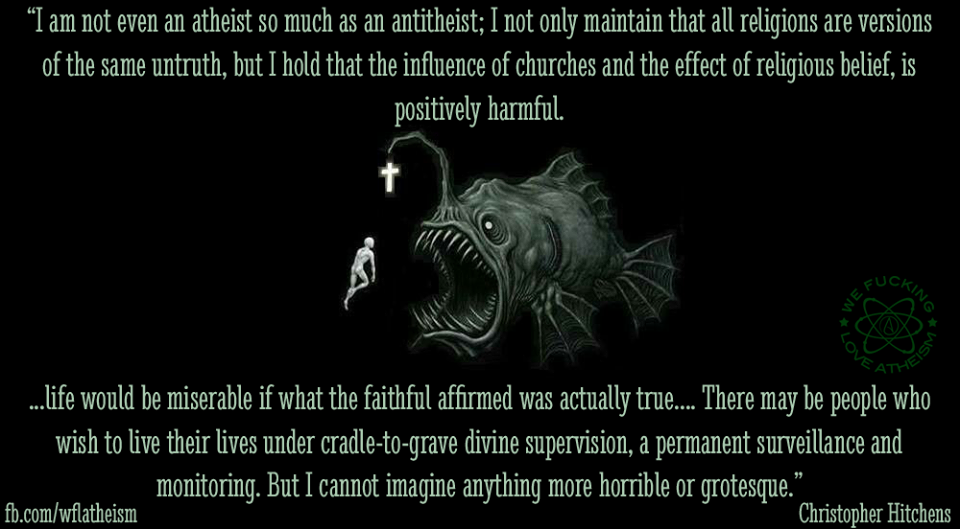 Atheism, Christopher Hitchens, Quotes Positively harmful Image March 5, 2015 We Fucking Love Atheism Leave a comment Share this: Click to share on X (Opens in new window) X Click to share on Facebook (Opens in new window) Facebook Click to share on Pinterest (Opens in new window) Pinterest Click to share on Tumblr (Opens in new window) Tumblr Click to share on Reddit (Opens in new window) Reddit Related