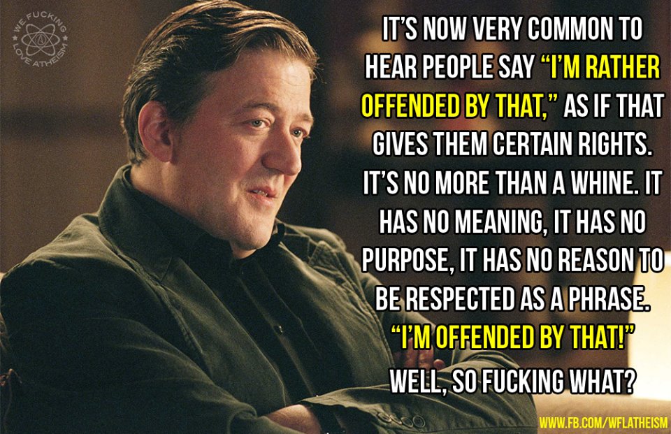 Atheism, Quotes, Stephen Fry I’m rather offended by that… Image March 12, 2015 We Fucking Love Atheism Leave a comment Share this: Click to share on X (Opens in new window) X Click to share on Facebook (Opens in new window) Facebook Click to share on Pinterest (Opens in new window) Pinterest Click to share on Tumblr (Opens in new window) Tumblr Click to share on Reddit (Opens in new window) Reddit Related