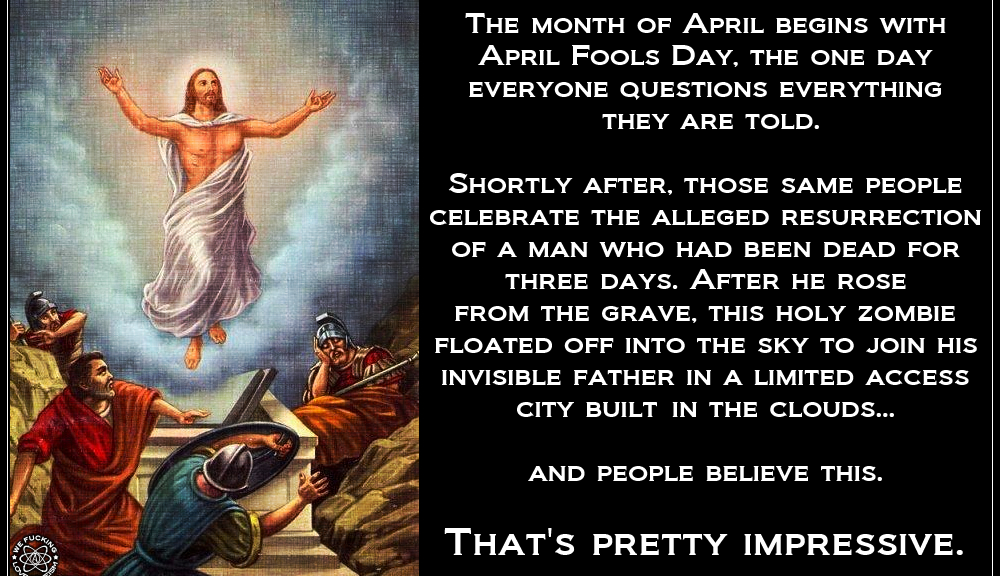 Agnostic, Atheism, Holidays, Humor That’s pretty impressive Image April 2, 2015 We Fucking Love Atheism Leave a comment Share this: Click to share on X (Opens in new window) X Click to share on Facebook (Opens in new window) Facebook Click to share on Pinterest (Opens in new window) Pinterest Click to share on Tumblr (Opens in new window) Tumblr Click to share on Reddit (Opens in new window) Reddit Related
