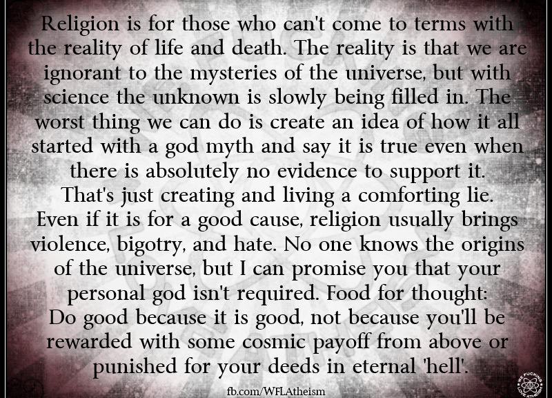 Agnostic, Atheism, Female Voices, Secular Humanist The reality of life and death Image April 9, 2015 We Fucking Love Atheism Leave a comment Share this: Click to share on X (Opens in new window) X Click to share on Facebook (Opens in new window) Facebook Click to share on Pinterest (Opens in new window) Pinterest Click to share on Tumblr (Opens in new window) Tumblr Click to share on Reddit (Opens in new window) Reddit Related