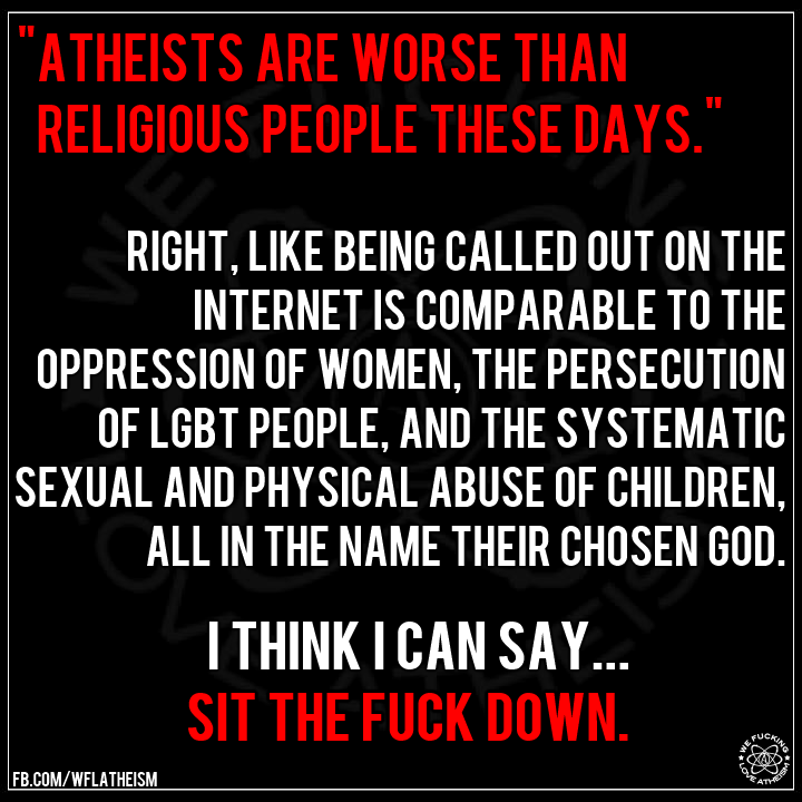 Agnostic, Atheism, Equality, Humor Sit the fuck down Image June 10, 2015 We Fucking Love Atheism Leave a comment Share this: Click to share on X (Opens in new window) X Click to share on Facebook (Opens in new window) Facebook Click to share on Pinterest (Opens in new window) Pinterest Click to share on Tumblr (Opens in new window) Tumblr Click to share on Reddit (Opens in new window) Reddit Related