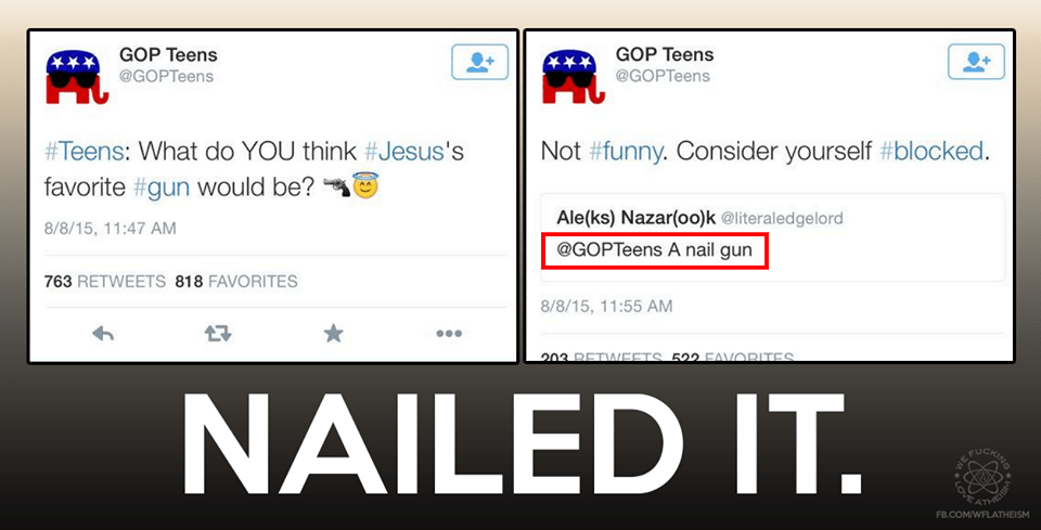 Agnostic, Atheism, Humor Nailed It! Image August 11, 2015 We Fucking Love Atheism Leave a comment Share this: Click to share on X (Opens in new window) X Click to share on Facebook (Opens in new window) Facebook Click to share on Pinterest (Opens in new window) Pinterest Click to share on Tumblr (Opens in new window) Tumblr Click to share on Reddit (Opens in new window) Reddit Related