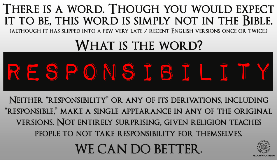 Agnostic, Atheism, Bible Verses, Secular Humanist Responsibility Image September 18, 2015 We Fucking Love Atheism 1 Comment Share this: Click to share on X (Opens in new window) X Click to share on Facebook (Opens in new window) Facebook Click to share on Pinterest (Opens in new window) Pinterest Click to share on Tumblr (Opens in new window) Tumblr Click to share on Reddit (Opens in new window) Reddit Related