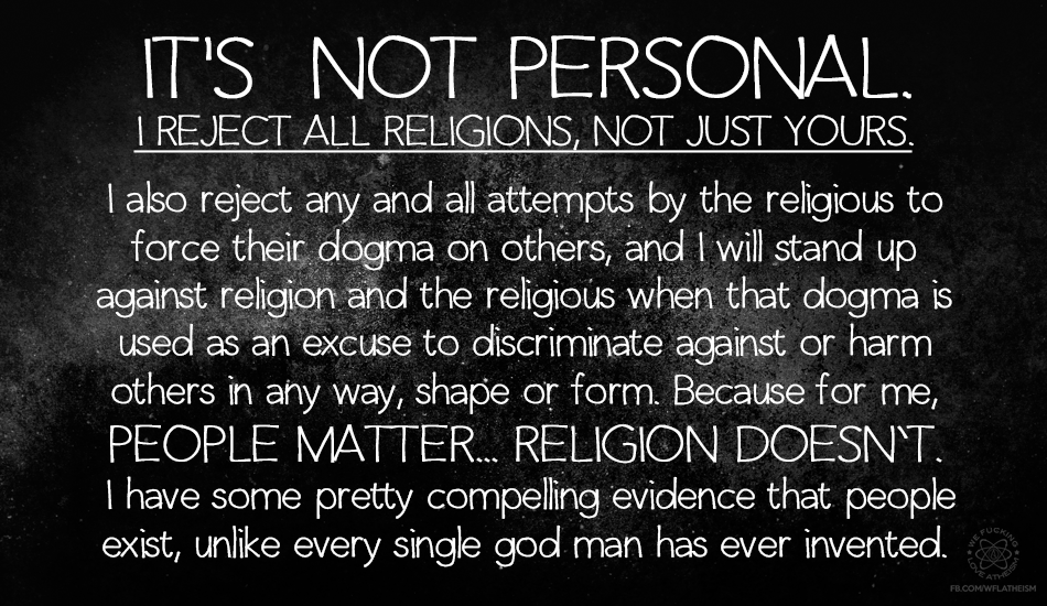 Agnostic, Atheism, Secular Humanist I reject all religions Image November 5, 2015 We Fucking Love Atheism Leave a comment Share this: Click to share on X (Opens in new window) X Click to share on Facebook (Opens in new window) Facebook Click to share on Pinterest (Opens in new window) Pinterest Click to share on Tumblr (Opens in new window) Tumblr Click to share on Reddit (Opens in new window) Reddit Related