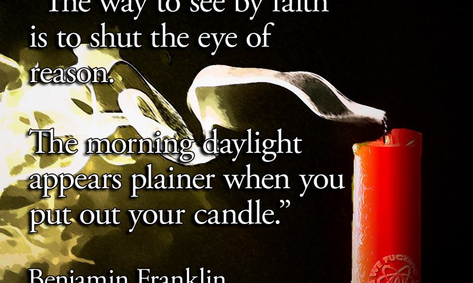 Atheism, Benjamin Franklin, Founding Fathers, Quotes To see by faith is to shut the eyes of reason. Image October 16, 2014 We Fucking Love Atheism Leave a comment