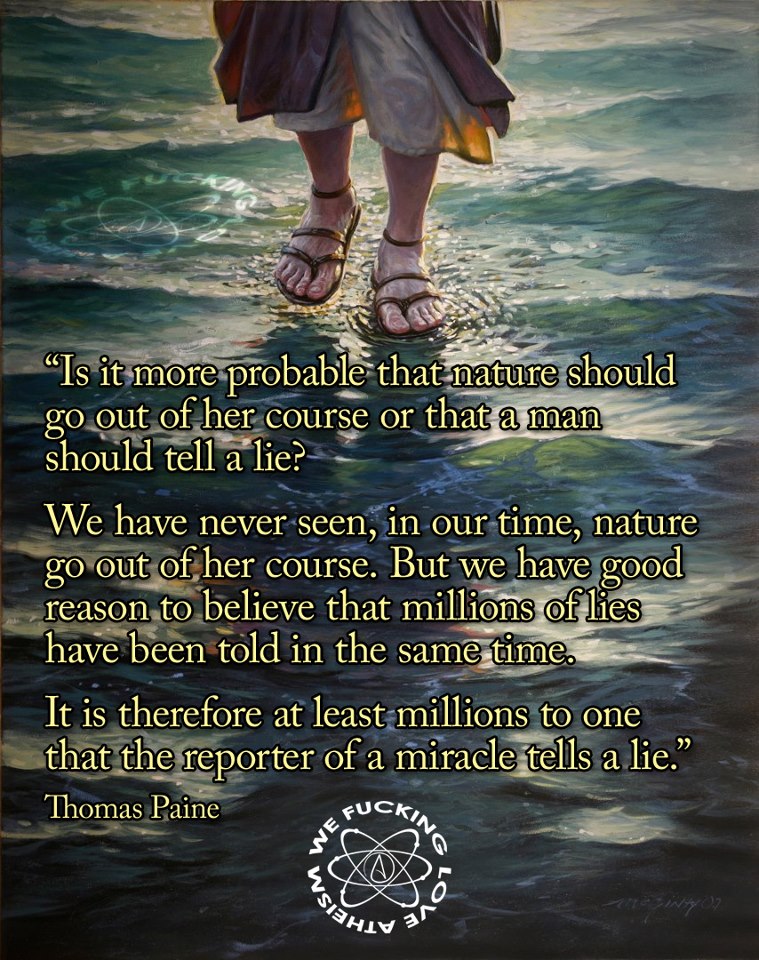 Atheism, Founding Fathers, Quotes, Thomas Paine The report of a miracle is a lie. Image October 16, 2014 We Fucking Love Atheism Leave a comment
